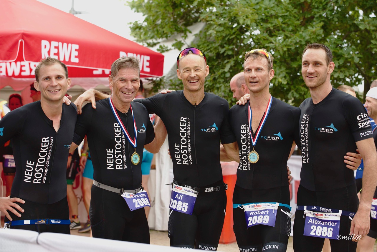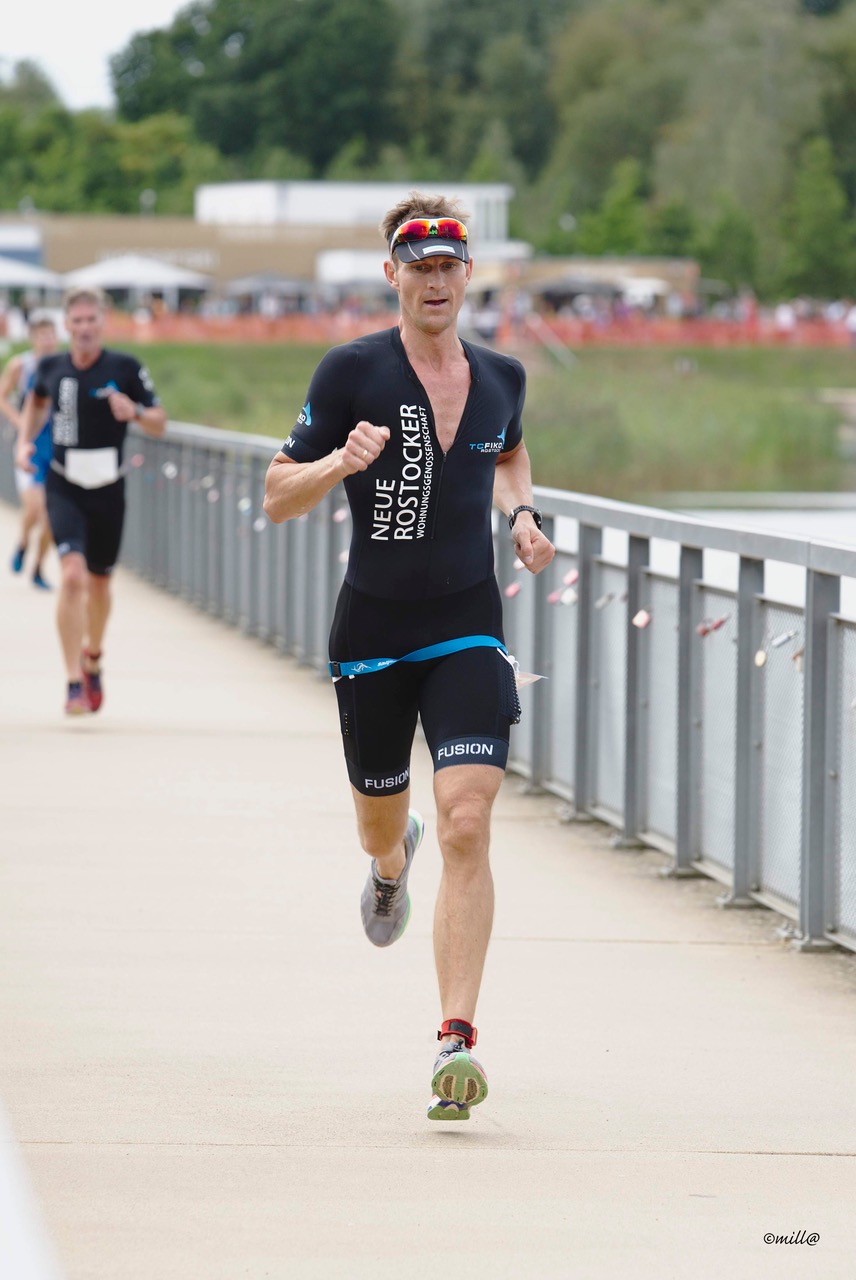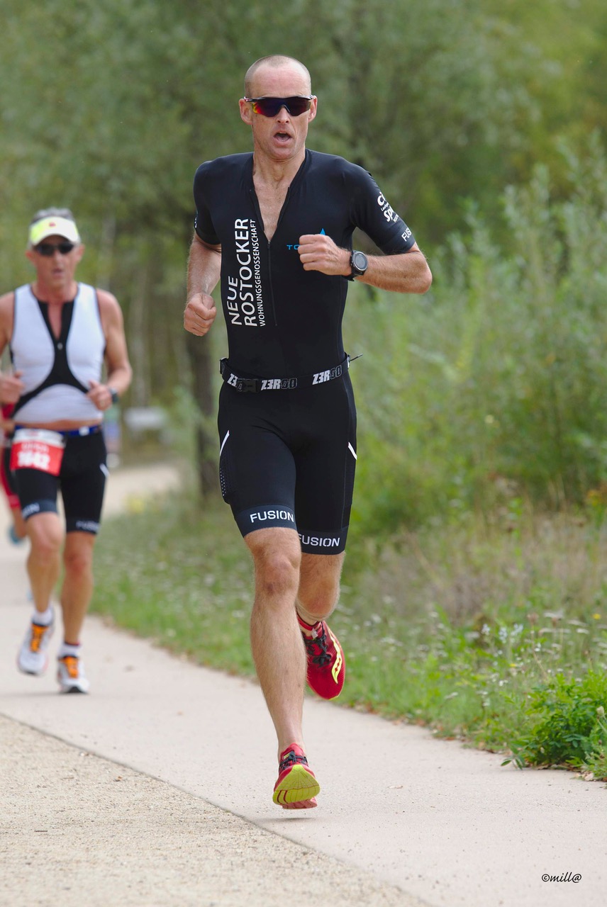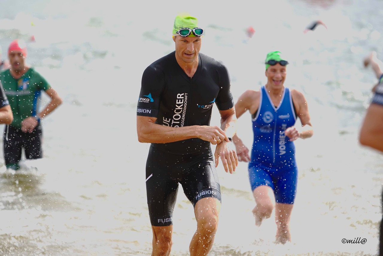 Dem Stadtpark – See entstieg Coach Andreas nach 750m als erstes der 5 Starter und mit Platz 11. knapp hinter der Spitzengruppe. Die verbleibenden Rostocker machten sich auf den Plätzen 32., 46., 54. und 68. auf die Verfolgung. Auf dem Rad wurde deutlich, dass unsere Jungs der Konkurrenz in nichts nachstehen. In gewohnter Manier schob sich Alex auf den 20km an den meisten Mitstreitern vorbei und zeigte mit dem 5. schnellsten Radsplit seine Stärke. Aber auch das Gespann um Alf, Robert und Andreas M. trugen sich mit ihren Radzeiten in die TOP 20 des Tages ein.